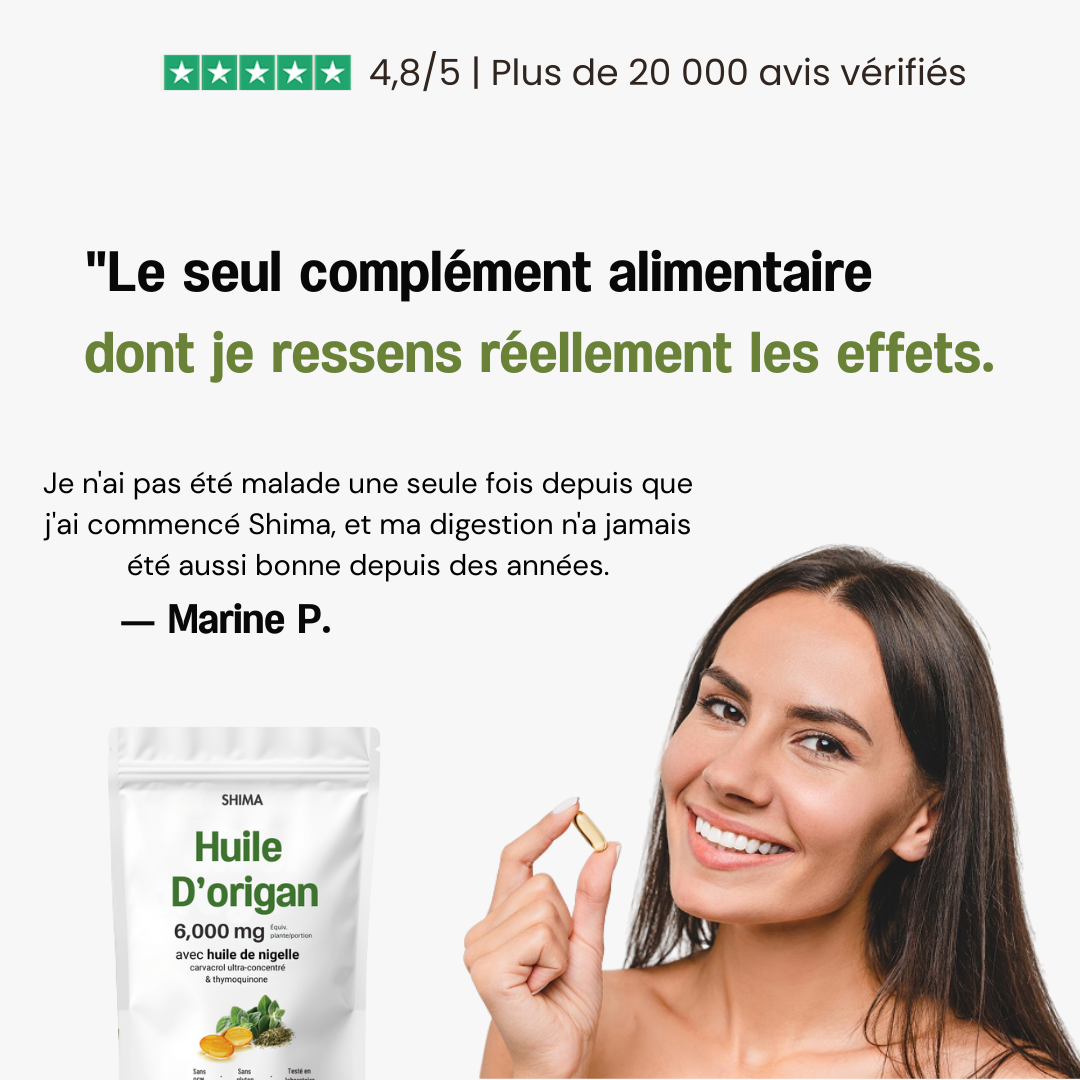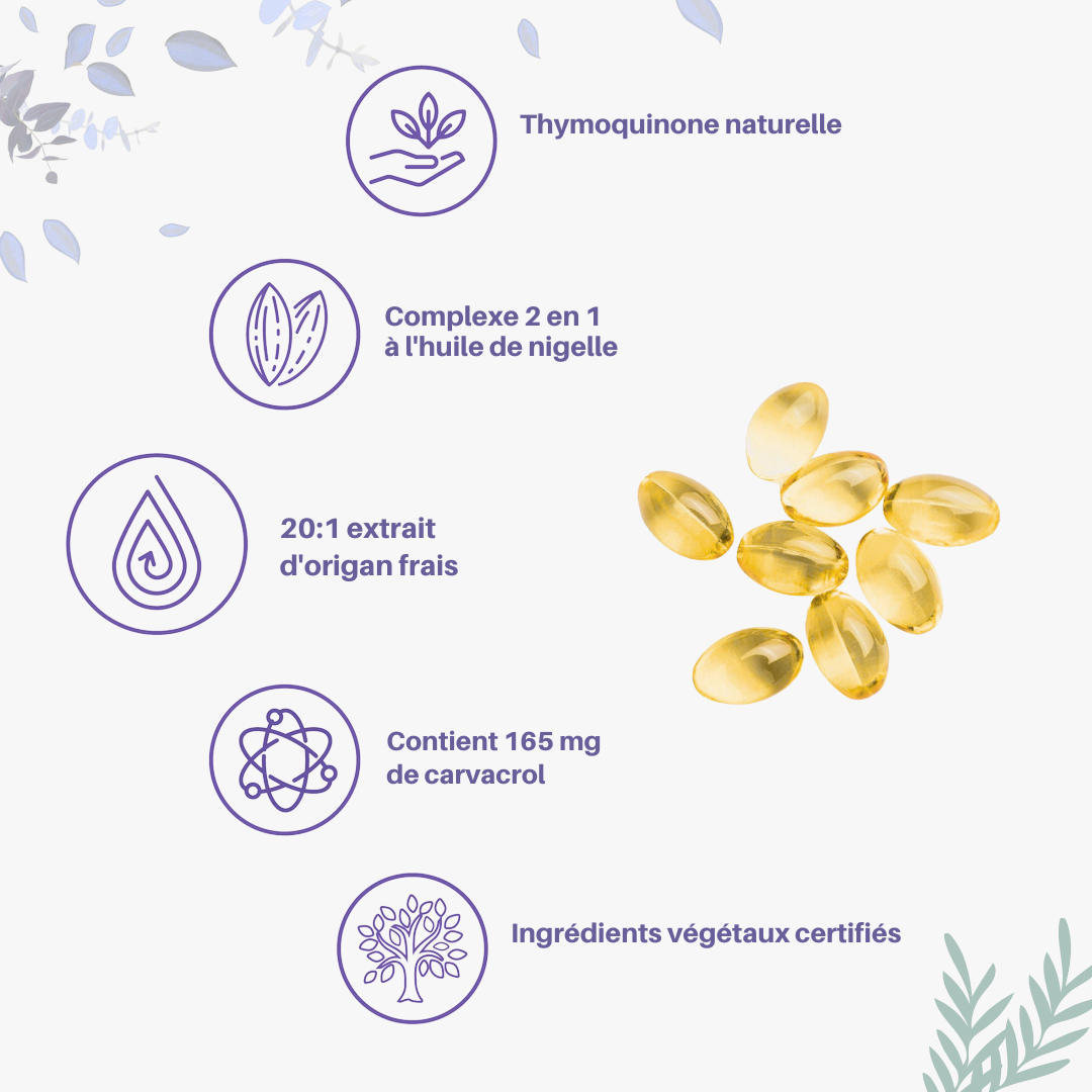 Grâce à sa formule concentrée en carvacrol et thymoquinone, elle soutient vos défenses naturelles en douceur. En quelques jours seulement, vous vous sentez plus résilient, moins fatigué et mieux protégé.