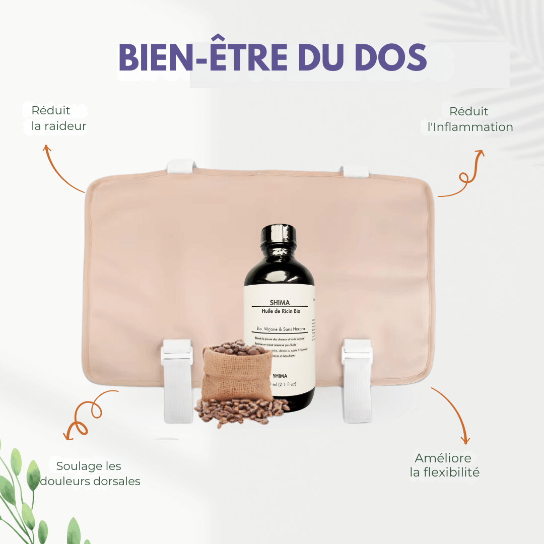 Notre Kit est essentiel car il conserve la chaleur en retenant celle de votre corps à l'intérieur. Cela permet à l'huile de ricin de pénétrer profondément dans votre peau, vous offrant ainsi tous ses bienfaits ! Sans notre Kit Bien-Être, l'huile ne s'absorbe que superficiellement, offrant peu ou pas de bénéfices.