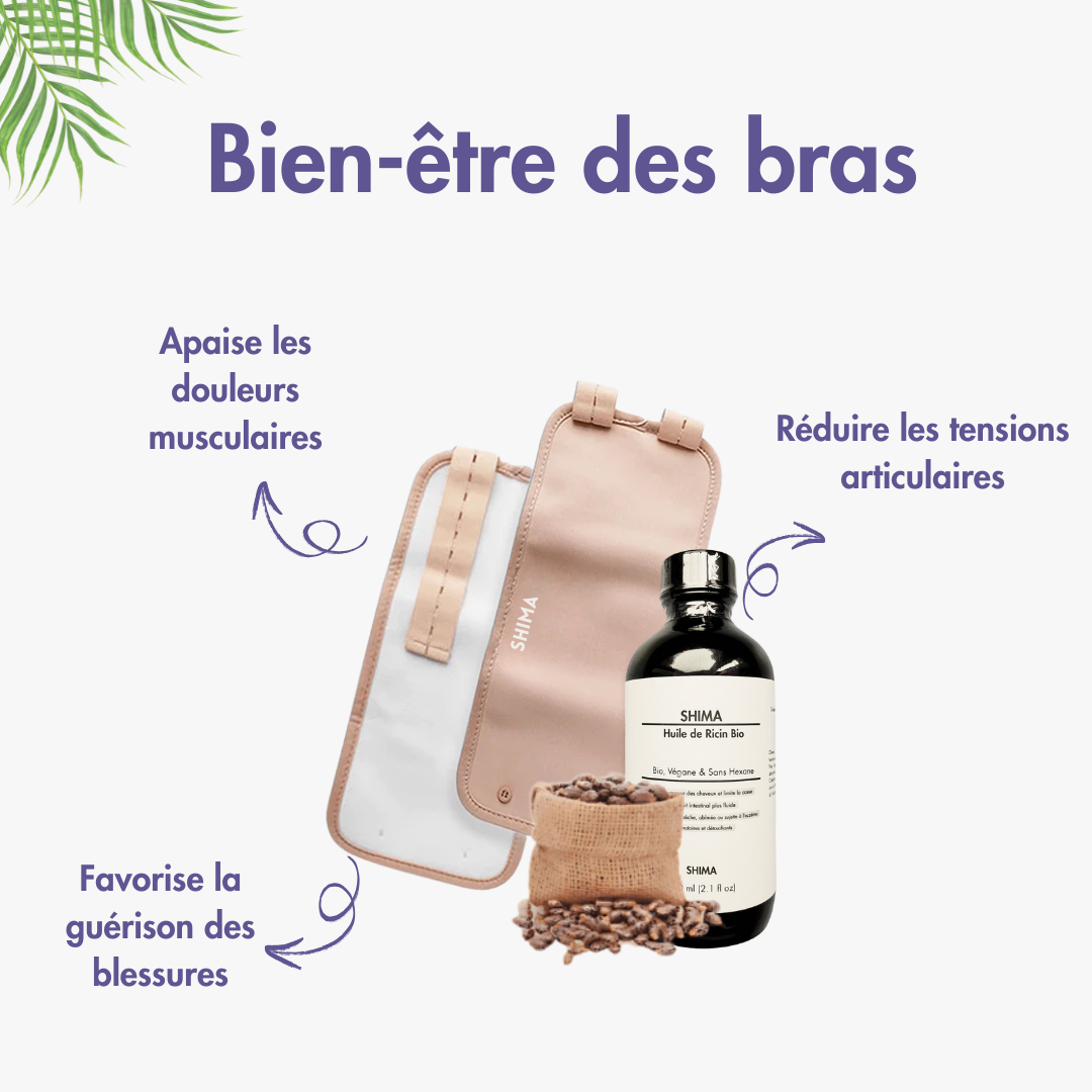 Notre Kit est essentiel car il conserve la chaleur en retenant celle de votre corps à l'intérieur. Cela permet à l'huile de ricin de pénétrer profondément dans votre peau, vous offrant ainsi tous ses bienfaits ! Sans notre Kit Bien-Être, l'huile ne s'absorbe que superficiellement, offrant peu ou pas de bénéfices.